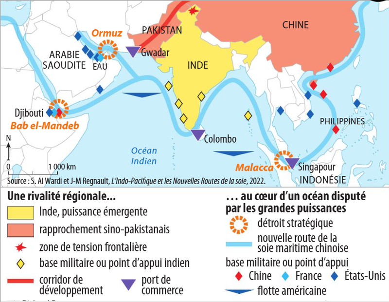 Au-delà de la dispute frontalière, l'Inde s'inquiète de la présence chinoise accrue dans l'océan indien - surtout depuis que la Chine a commencé à financer et à construire des ports sur les côtes pakistanaises, sri-lankaise et bangladaise (…). Le collier de perles tisait par la Chine serait un réseau de bases (…).