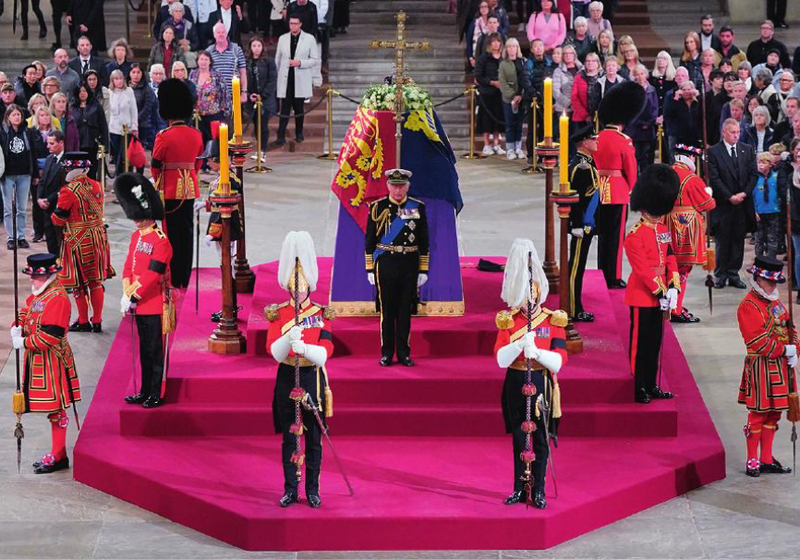 Le roi Charles III, gouverneur suprême de l’Église anglicane d’Angleterre, et la famille royale assistent aux funérailles de la reine Élisabeth II lors de la cérémonie à l’Abbaye de Westminster, le 19 septembre 2022.