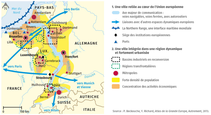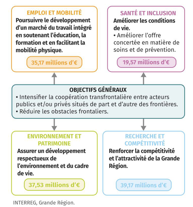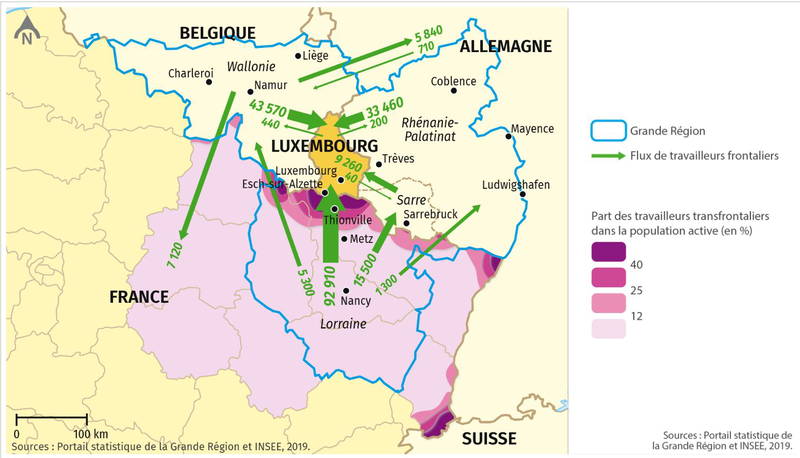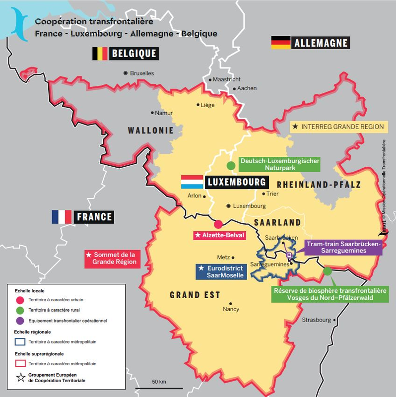 Au nord-est du territoire français aux confins de la Belgique, de l'Allemagne et du Luxembourg se développe l'une des coopérations transfrontalières les plus abouties en Europe. La Grande Région recoupe des territoires très différenciés : une région à très haut niveau de vie, où les salaires sont élevés et les emplois nombreux (le Luxembourg), 2 régions à haut niveau de vie (la Rhénanie-Palatinat est la Sarre, en Allemagne), ainsi que 2 régions plus en difficulté (la Wallonie en Belgique et la Lorraine en France).