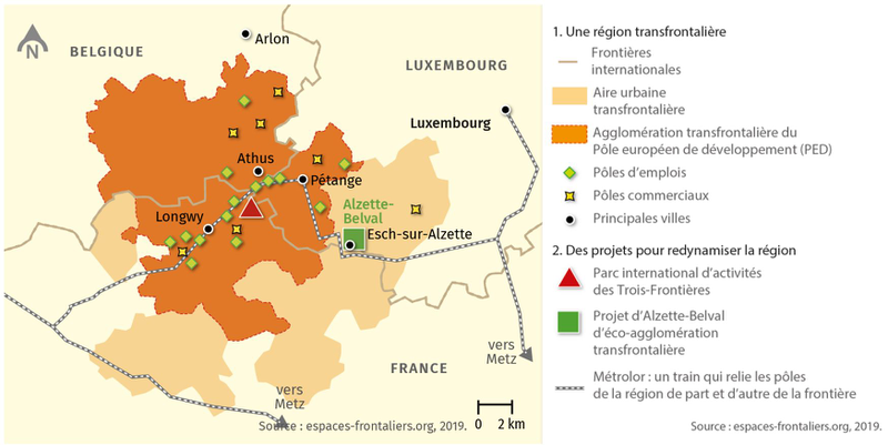 Confrontés au défi commun de la crise industrielle, ces espaces se sont rassemblés au sein d'une structure de coopération interrégionale, la Grande Région, dans le cadre du programme européen Interreg. Elle bénéficie, à ce titre, de nombreux financements européens venant de Bruxelles. Les acteurs locaux et régionaux ont ainsi développé des projets locaux de reconversion à dimension transfrontalière, associant des acteurs de part et d'autre des frontières nationales, comme à Alzette-Belval. Il a également été nécessaire d'aménager des moyens de transport transfrontaliers à l'image du train qui relie Nancy, Metz et Luxembourg.