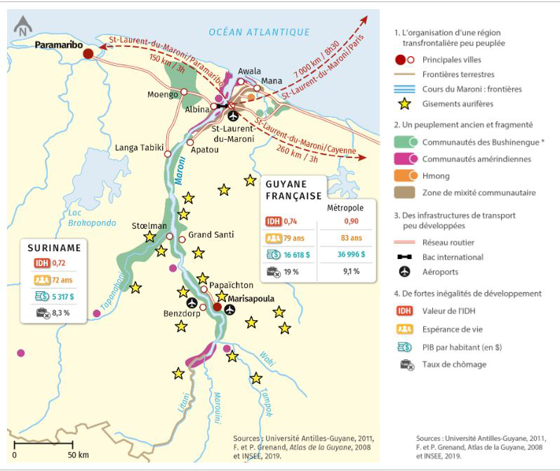 Une frontière ne constitue pas forcément une discontinuité, une limite ou une marge. Le fleuve Maroni et ses affluents relient en effet les territoires plus qu'ils ne les séparent, la population y vit traditionnellement « à cheval » sur les 2 rives. Par conséquent le fleuve constitue plutôt un trait d'union entre communautés qu'une césure. Il se situe au centre d'une zone transfrontalière formant un espace d'échange, très dynamique, peuplé et actif qui met en contact les 2 rives.