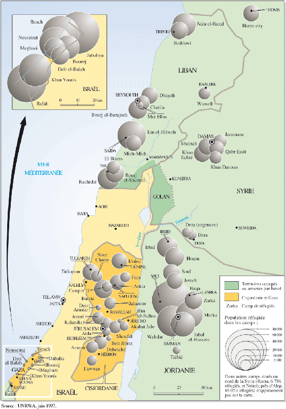 Sur les 3,6 millions de réfugiés palestiniens que compte le Proche-Orient en juin 1999, un tiers vivent dans les camps, et plus de la moitié hors de Palestine, dont une majorité en Jordanie, premier pays d’accueil. Pour tous se pose, depuis la première vague d’exil en 1948-49, la question du droit au retour.