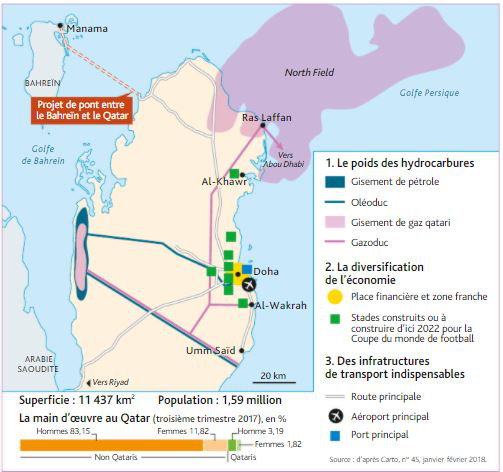 Le Qatar (…) cherche aujourd'hui à diversifier son économie qui repose en grande partie sur les hydrocarbures (…). Jouissant de la 3ème réserve mondiale de gaz, le Qatar se positionne comme le premier exportateur mondial de gaz naturel liquéfié (…). Le royaume du Qatar a pour ambition de faire de son territoire un haut lieu touristique et culturel (…). Le Qatar poursuit en parallèle une politique de développement d'infrastructures de transports, stimulée par l'approche de la Coupe du monde 2022 (…).